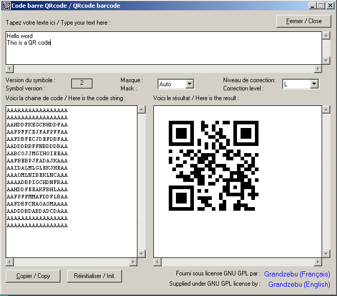 La fonction QRcode$ fait environ 900 lignes, je ne la reproduis donc pas ici, il suffit de la récuperer dans le fichier "form1.frm" qui se trouve avec le programme