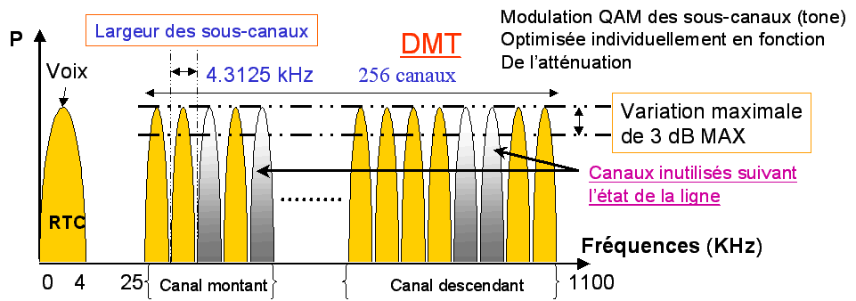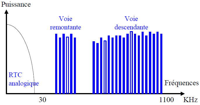 Technologie électronique permettant le transport de données numériques sur une simple ligne téléphonique. Les fréquences inférieures à 26 KHz sont réservées à la téléphonie analogique. Les données modulent des canaux de fréquence de plus en plus élevée.