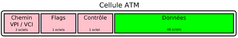 Protocole de transport de données par petits paquets : les cellules. Celles-ci ont une longueur de 53 octets dont 48 pour les données. Une connexion est définie par son chemin (VPI) et son canal (VCI). Les grands réseaux à l'échelle nationale utilisent ATM pour le transport de la voie, de l'image et des données.