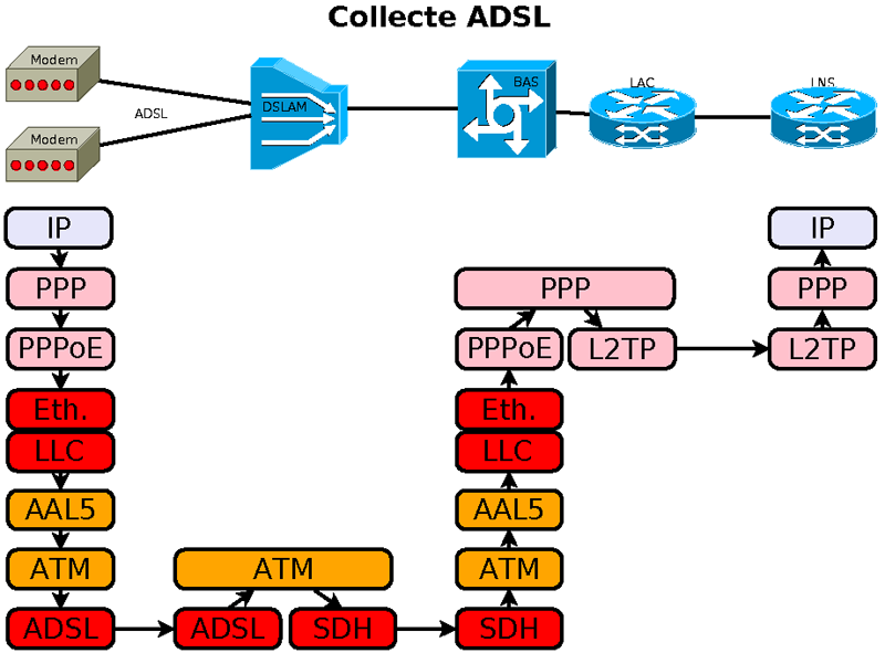 Equipement du fournisseur d'accès internet ou de l'opérateur de collecte Si le BAS appartient au F.A.I., c'est ici que se termine la liaison PPP commencée chez l'utilisateur; le BAS est connecté a un serveur RADIUS contenant les données d'identification des clients. Si le BAS appartient à un opérateur de collecte qui n'est pas le F.A.I., il transmet les données, souvent dans un tunnel L2TP, vers le réseau du F.A.I., lui-même connecté à l'internet.