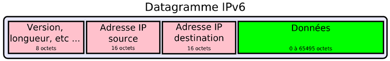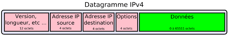 ( RFC 791 ) C'est le protocole majeur du réseau internet. (Niveau 3). On l'appelle v4 car ses adresses sont composées de 4 octets. Une version v6 est en cours de déploiement pour pallier au manque d'adresse IPv4. IP assure la fragmentation et le routage des données. Chaque datagramme possède une adresse de destination et va parcourir le réseau de manière autonome. L'en-tête d'un datagramme IP comporte au minimum 24 octets. La taille maximale du datatgramme IP est de 65535 octets.